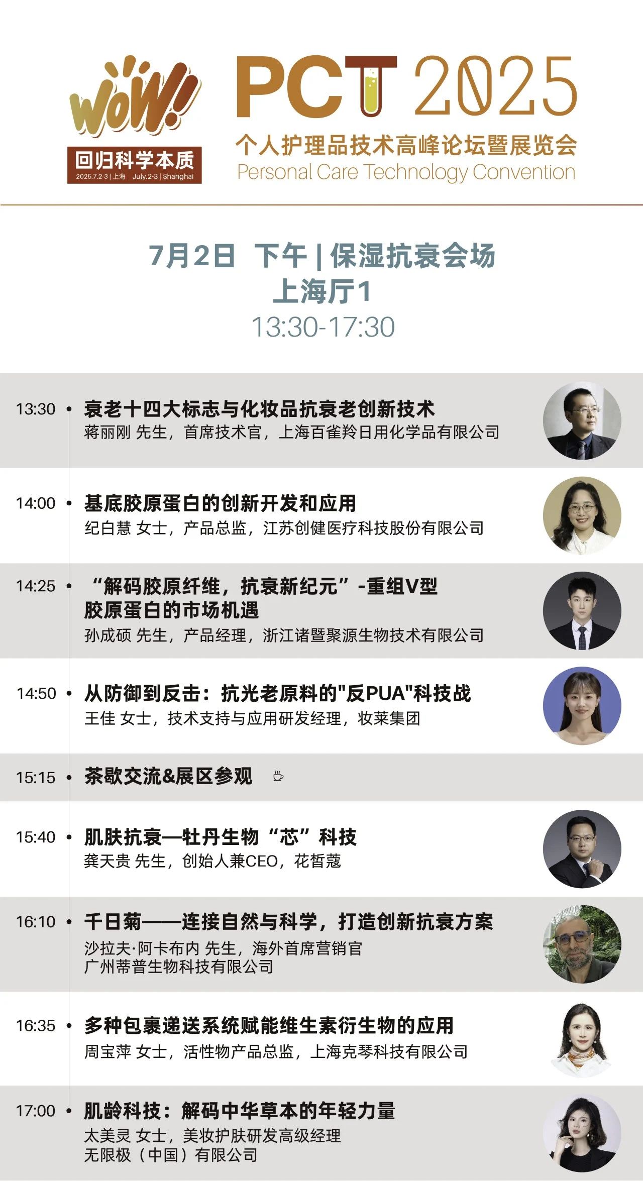 技術論壇:主要探究皮膚各類問題,比如保濕抗衰,修復舒緩,防曬美白,精準抗衰,頭皮與毛發護理,天然安全,法規檢測安評,合成生物,情緒護膚。