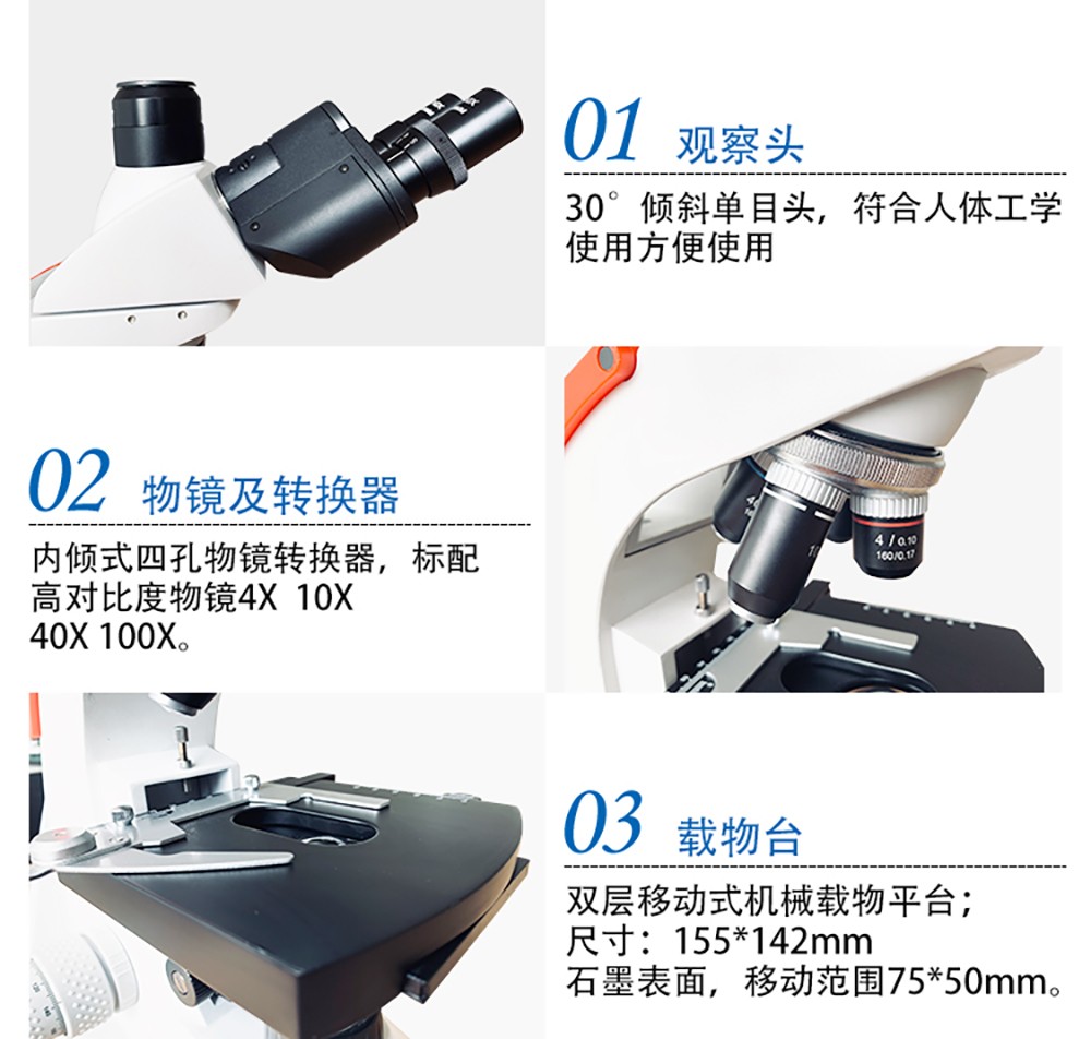 生物顯微鏡聚光鏡:N.A.1.25阿貝聚光鏡,精確限位設計齒輪齒條結構,確保更為準確的觀察高度。高度可自行調節。