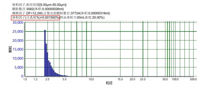 2)粒徑特征:顆粒平均粒徑 2.45μm,峰值粒徑 1.817μm,可精準計算 PFAT5(粒徑≥5μm 大乳粒體積分數),滿足安全性評估需求;